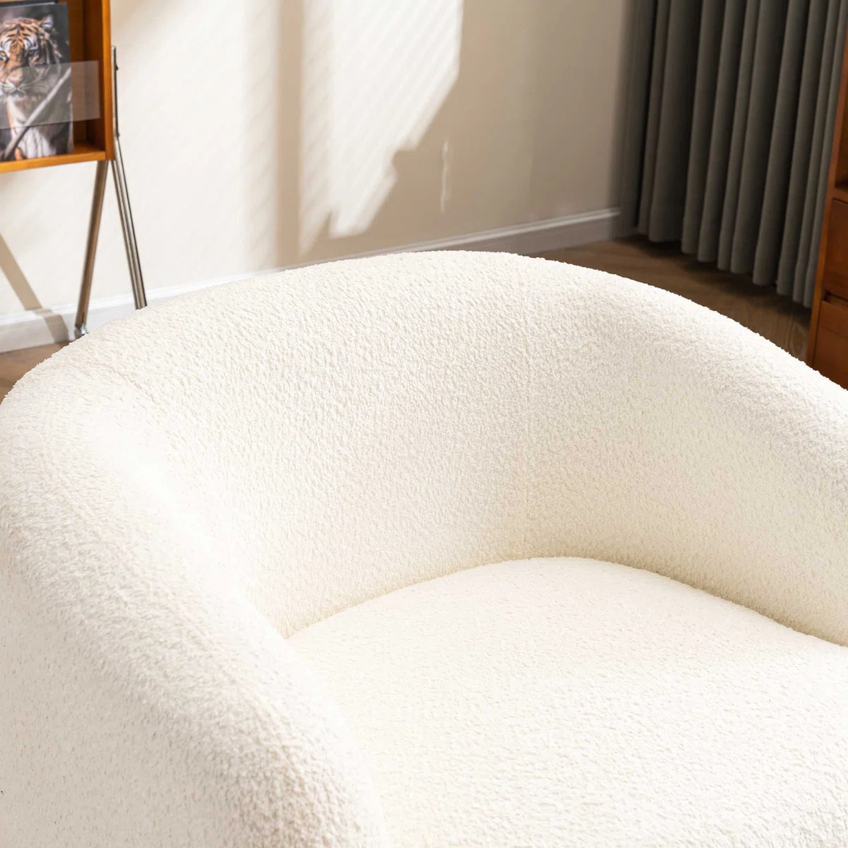 The Aurelia Bouclé Swivel Barrel Chair brings modern sophistication and cozy comfort into any living space. Designed with a rounded silhouette and enclosed back, it offers a chic yet inviting look. Upholstered in a textured polyester-blend bouclé fabric, the chair feels luxuriously soft while maintaining durability. A sturdy solid pine wood frame, sinuous spring construction, and high-density foam cushioning ensure lasting support. The sleek metal pedestal base allows smooth 360° swivel functionality, making it perfect for versatile use in living rooms, bedrooms, or vanity spaces. Fade-resistant fabric keeps the chair looking fresh, while its timeless design complements both contemporary and traditional interiors.