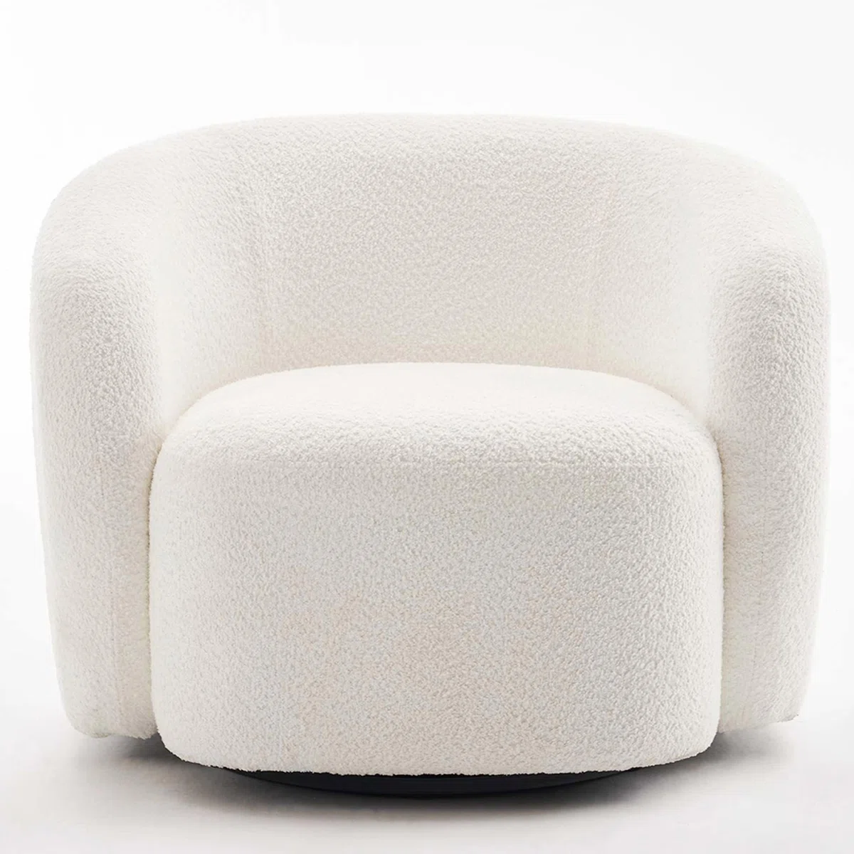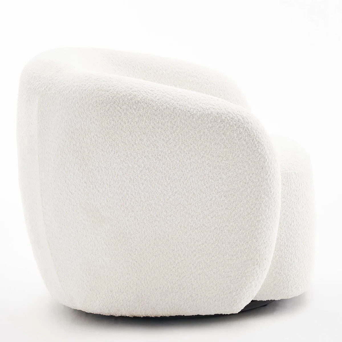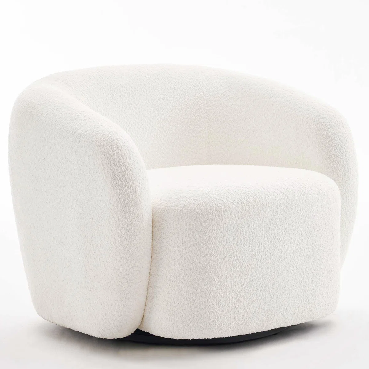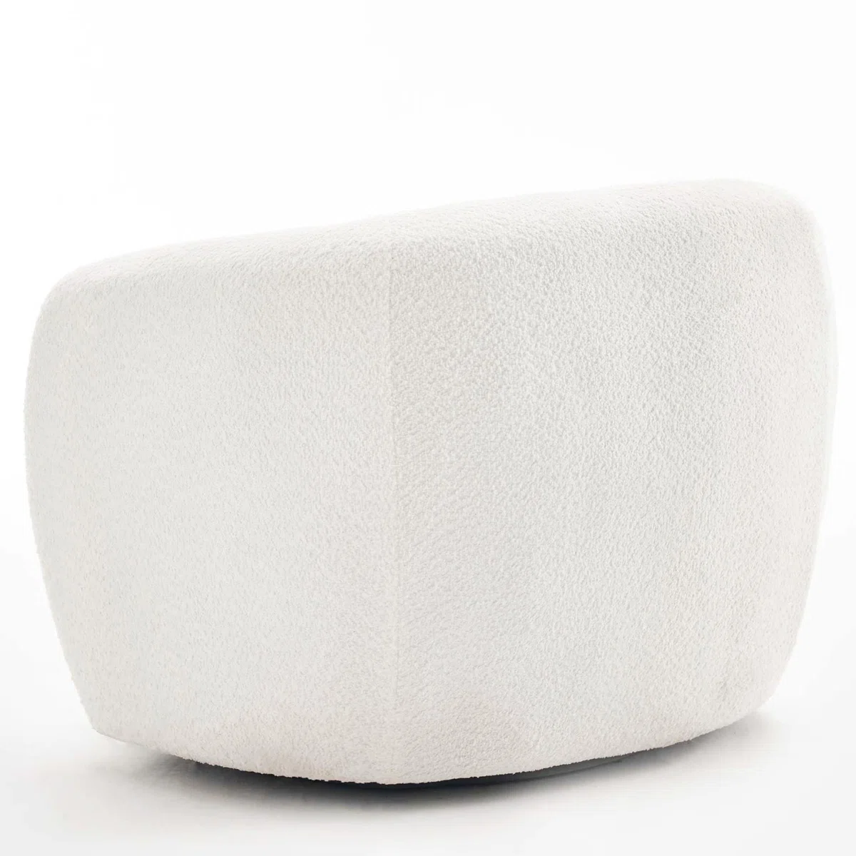 White bouclé upholstered swivel barrel chair with rounded silhouette, enclosed back, and black metal pedestal base