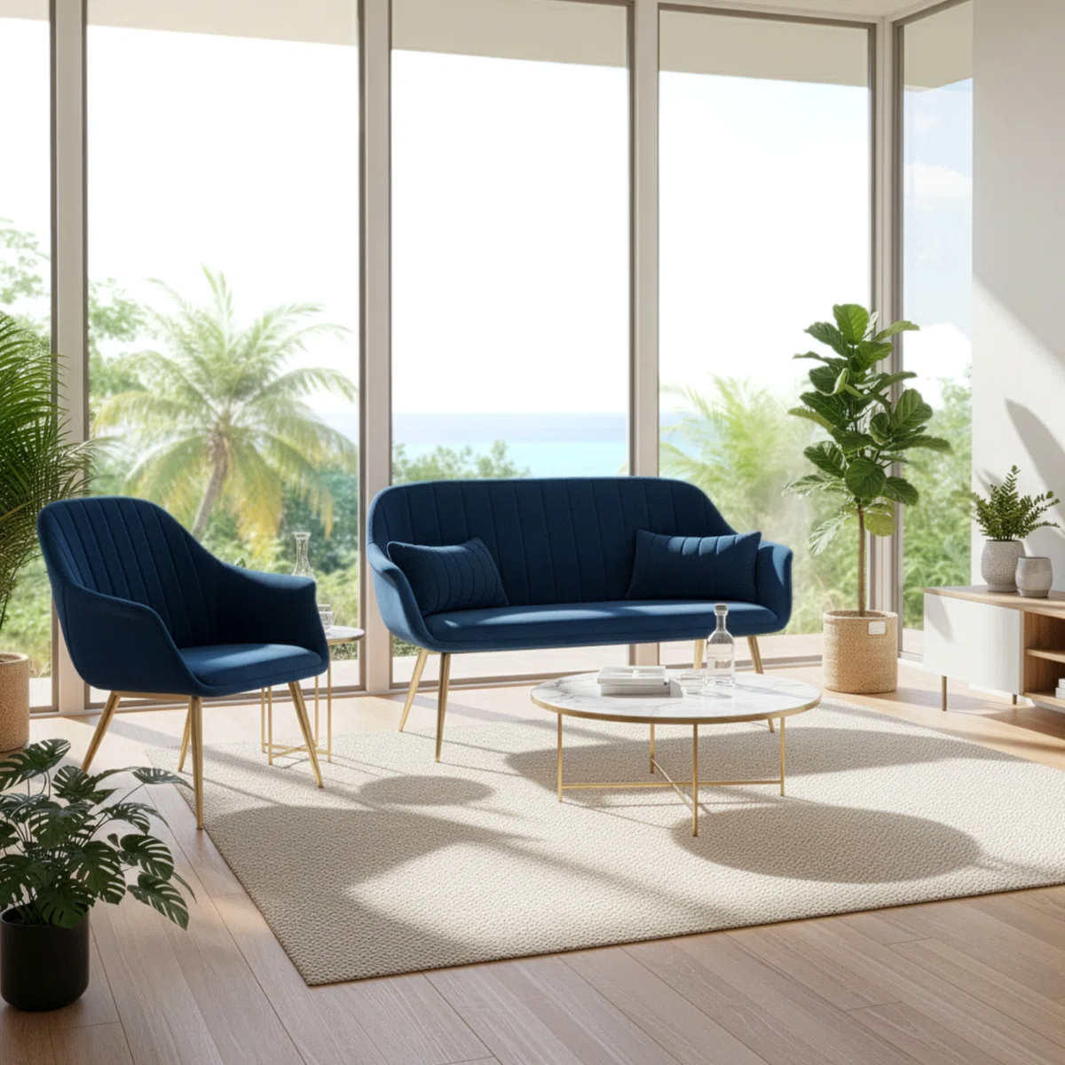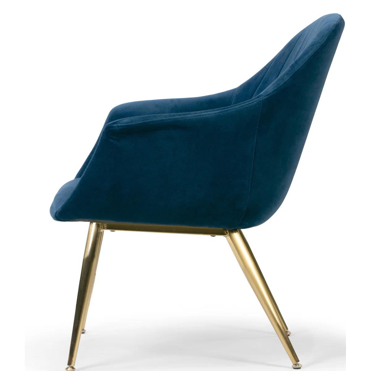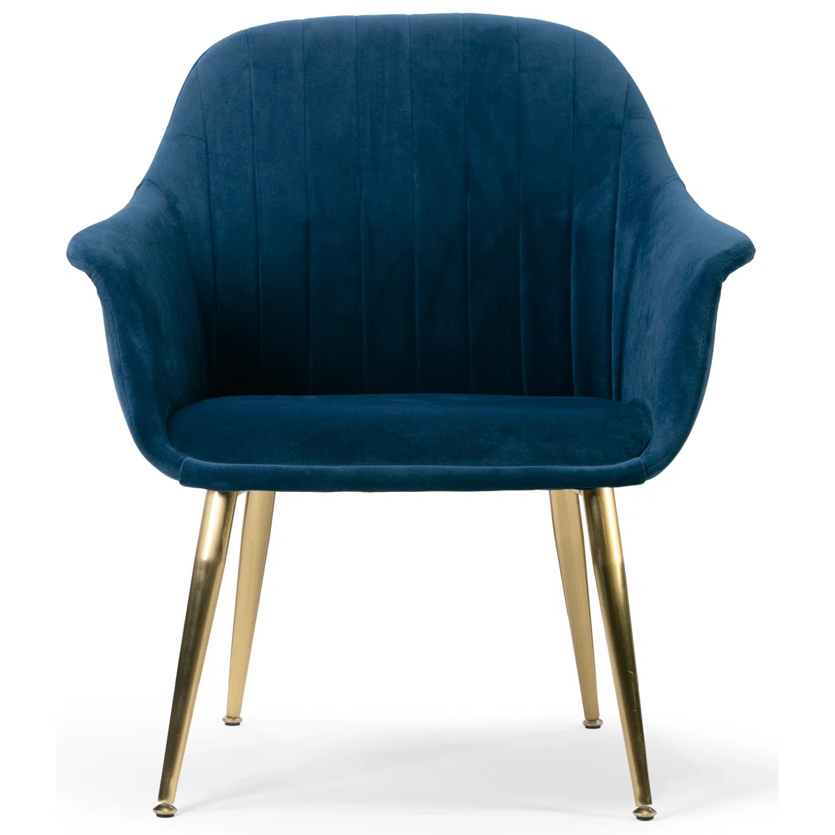 The Aurelia Velvet Accent Chair brings modern glamour to your living space. With its sleek silhouette, flared arms, and vertical channel tufting, it’s designed to be both stylish and inviting. Wrapped in rich blue velvet and supported by four tapered gold-finished legs, Aurelia adds a luxe touch to any room. Foam-filled cushions provide lasting comfort, making it the perfect spot to unwind with a book or enjoy a conversation.