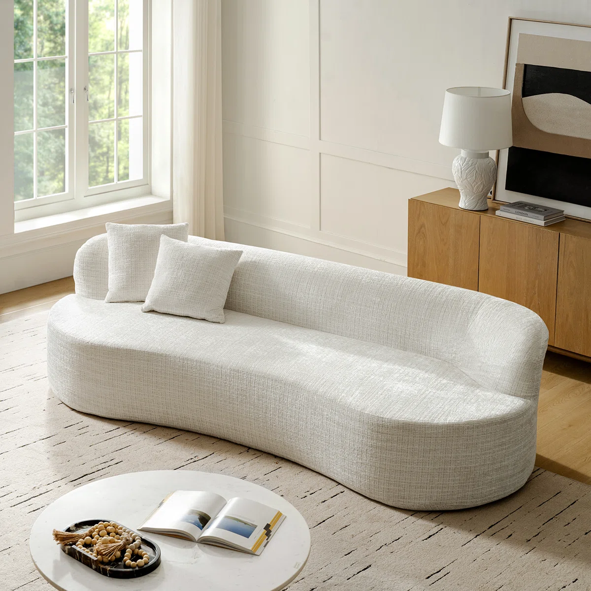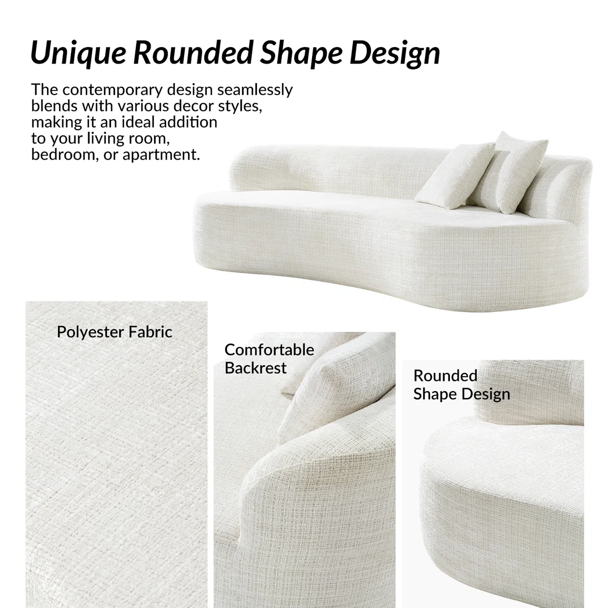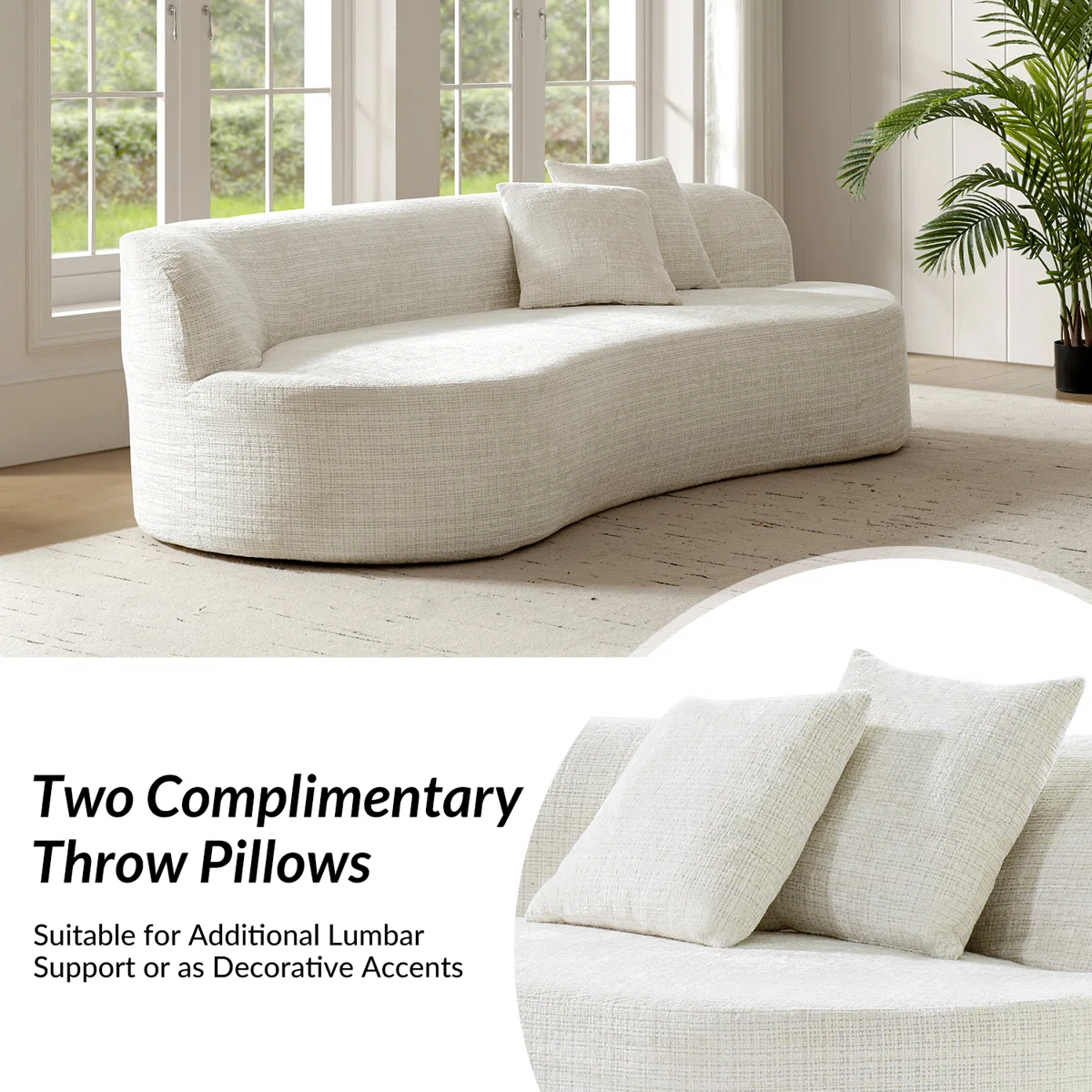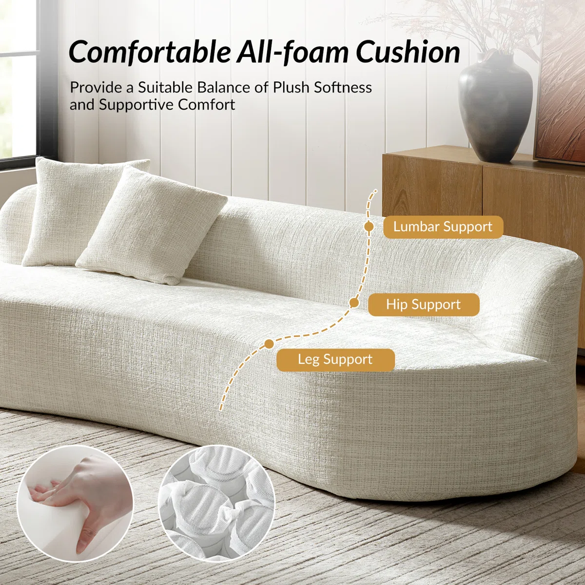 Ivory modern foam sofa with curved design, deep seating, and two matching pillows in a minimalist living space