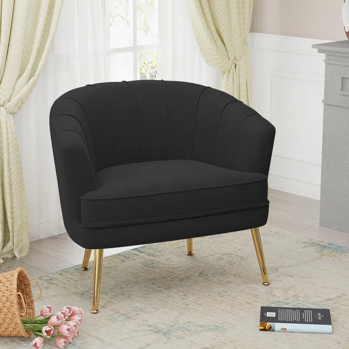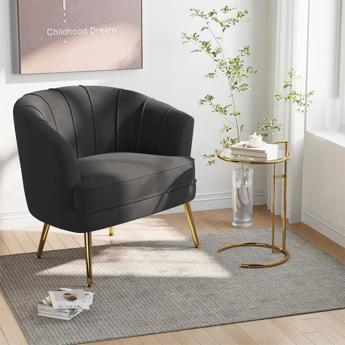 Celeste 69 cm wide velvet upholstered armchair with barrel silhouette, vertical channel stitching, curved back, sloping arms, and tapered gold‑finished metal legs