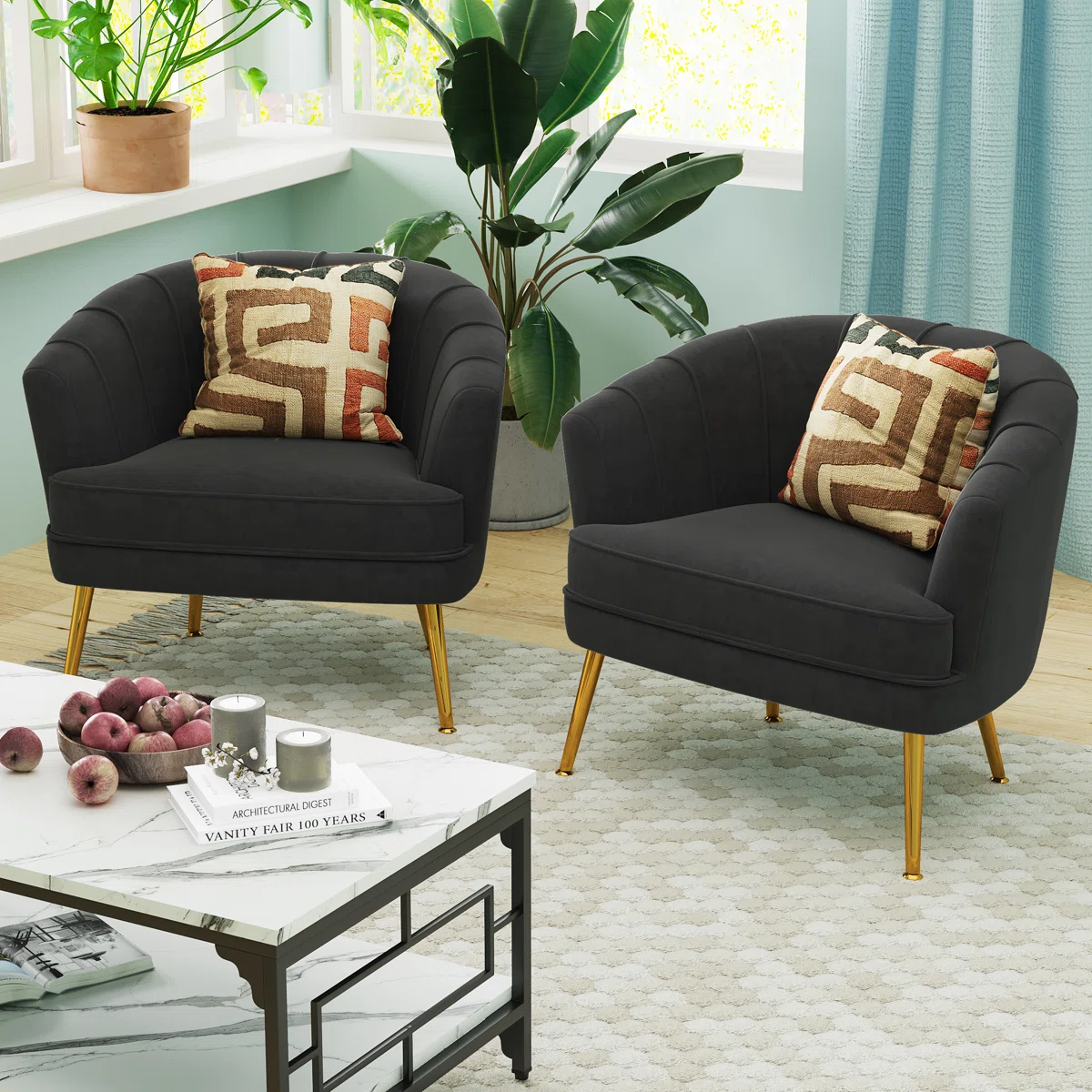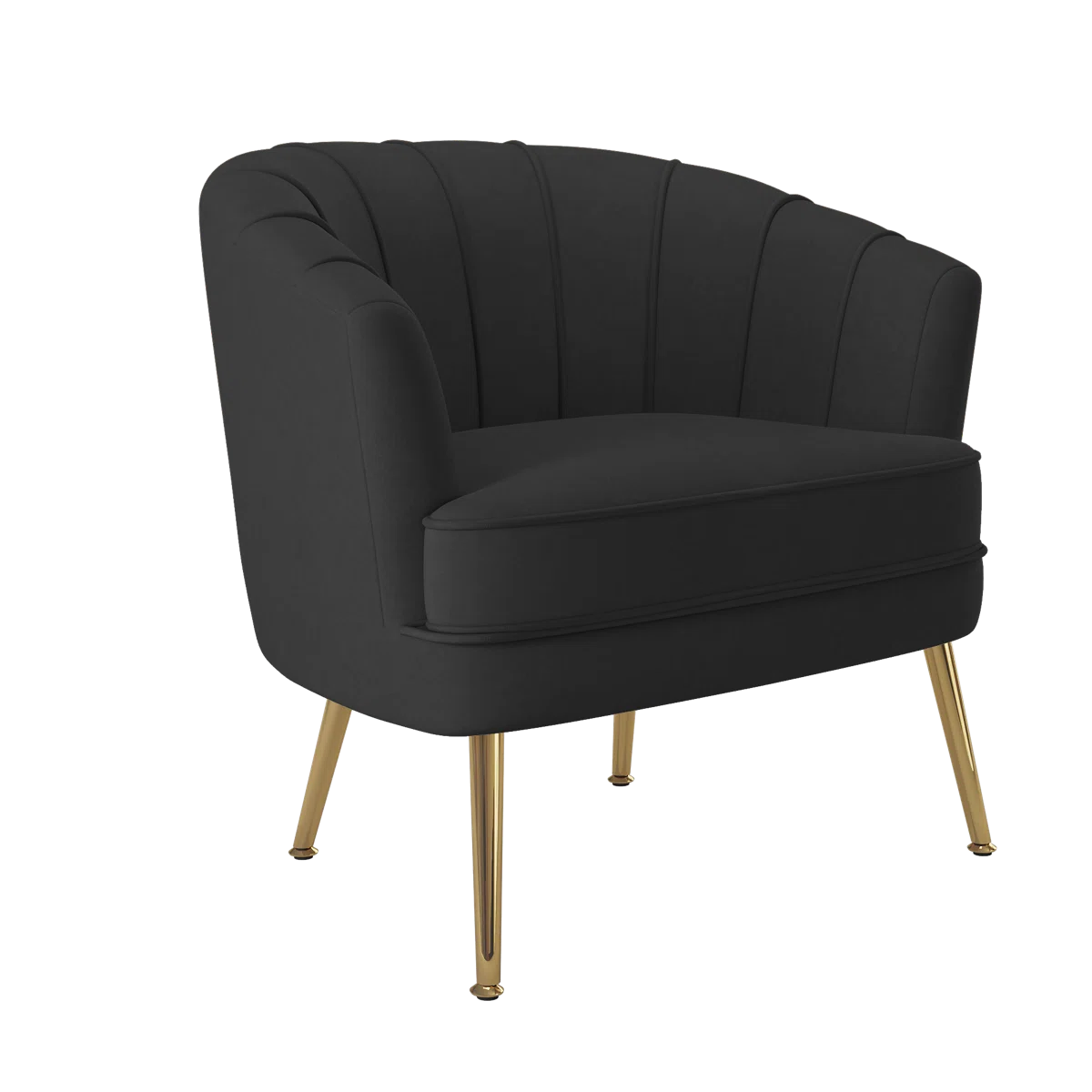 The Celeste Upholstered Armchair blends relaxed glamour with inviting comfort. Its chic barrel silhouette and gently curved back create a timeless yet modern profile, while sloping arms and plush foam cushioning envelop you in softness. Upholstered in luxurious velvet with vertical channel stitching, this chair adds depth and texture to any space. Four tapered, gold‑finished metal legs provide a subtle shine and stability, making Celeste a versatile accent piece for both contemporary and transitional interiors.