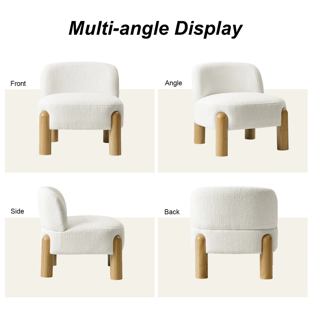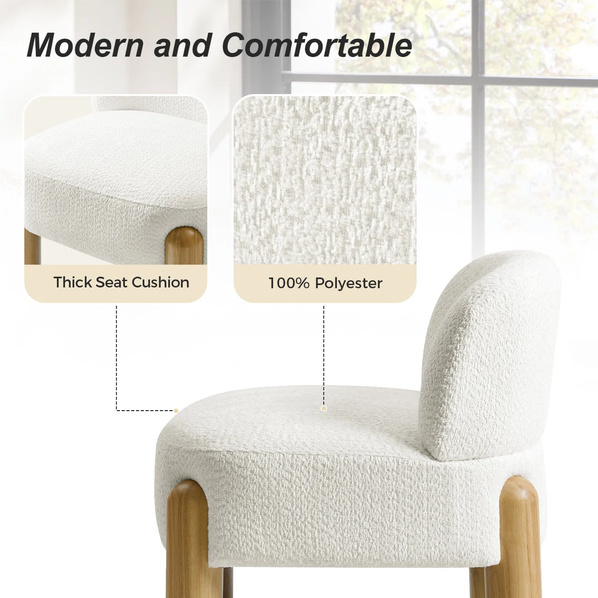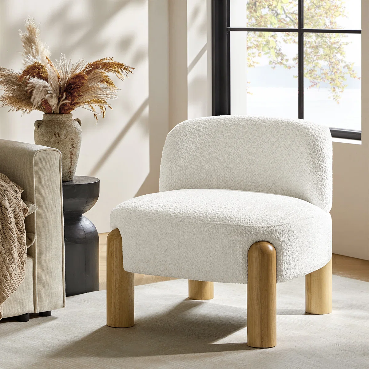 The Elara Bouclé Armless Accent Chair offers a sleek, modern silhouette with a supportive fixed back and tailored armless profile. Upholstered in textured bouclé fabric, it delivers a soft, tactile feel while foam cushioning ensures lasting comfort. Crafted with a solid and engineered wood frame and supported by natural rubberwood legs, this chair balances durability with contemporary elegance. Adjustable foot pads keep the seat level on uneven floors, making it a versatile choice for living rooms, bedrooms, or compact spaces where style and function matter.