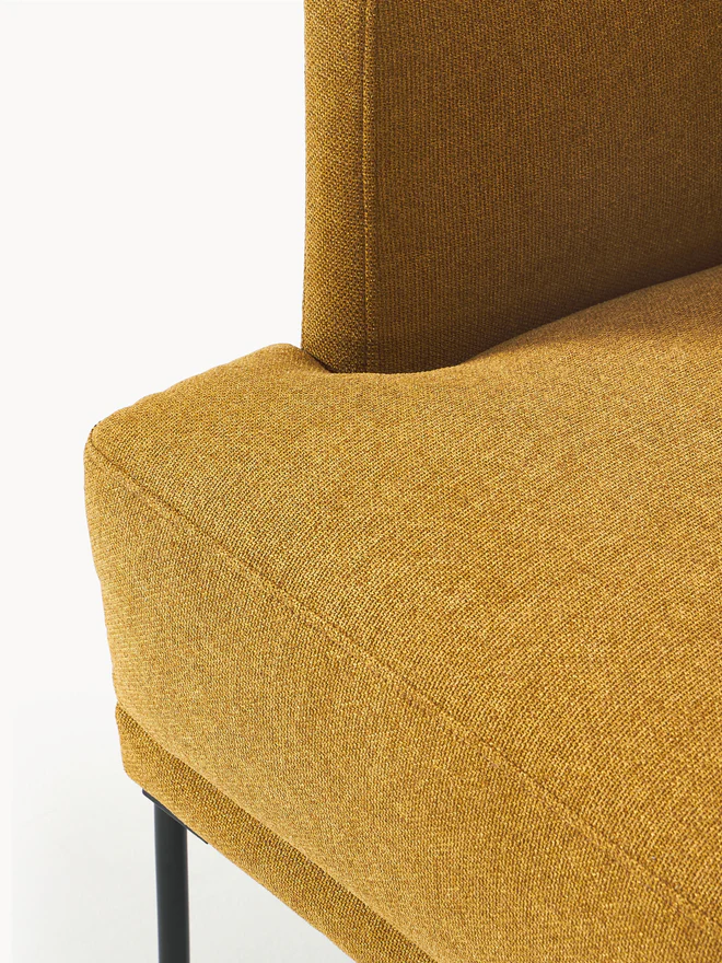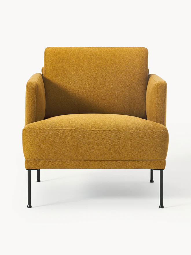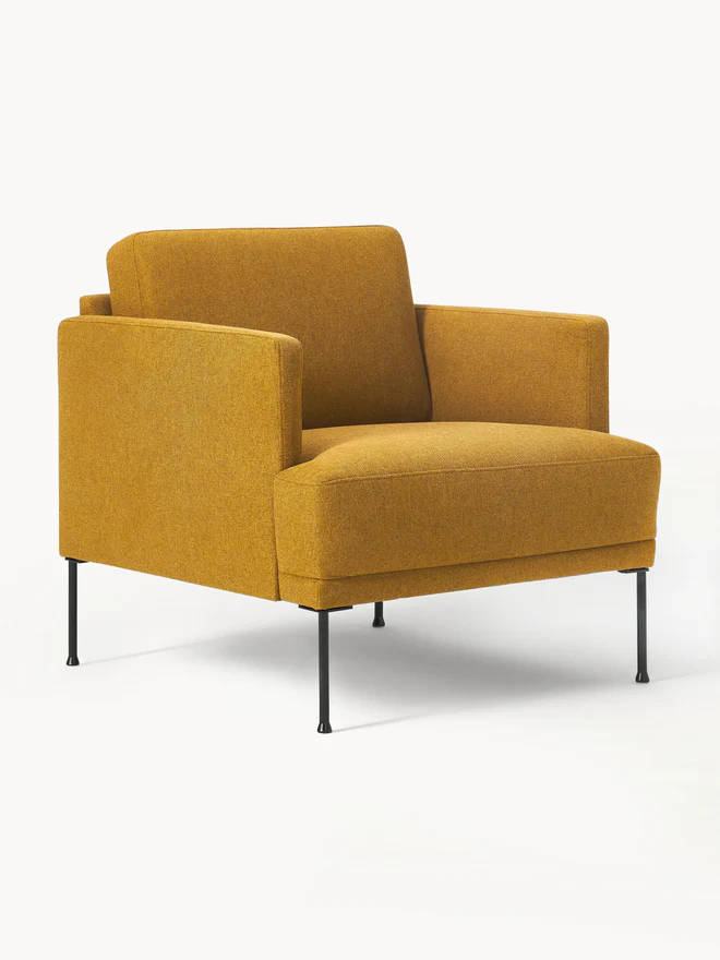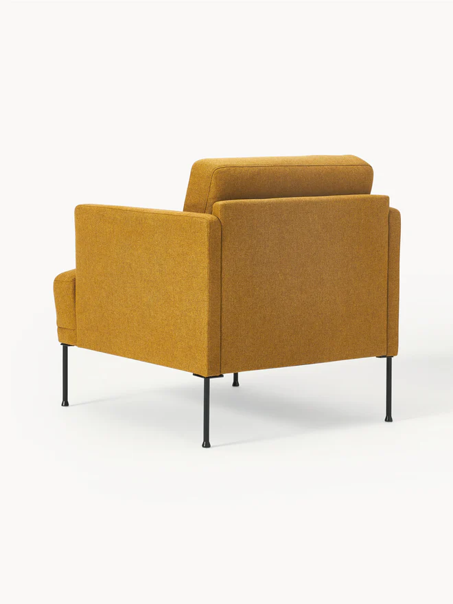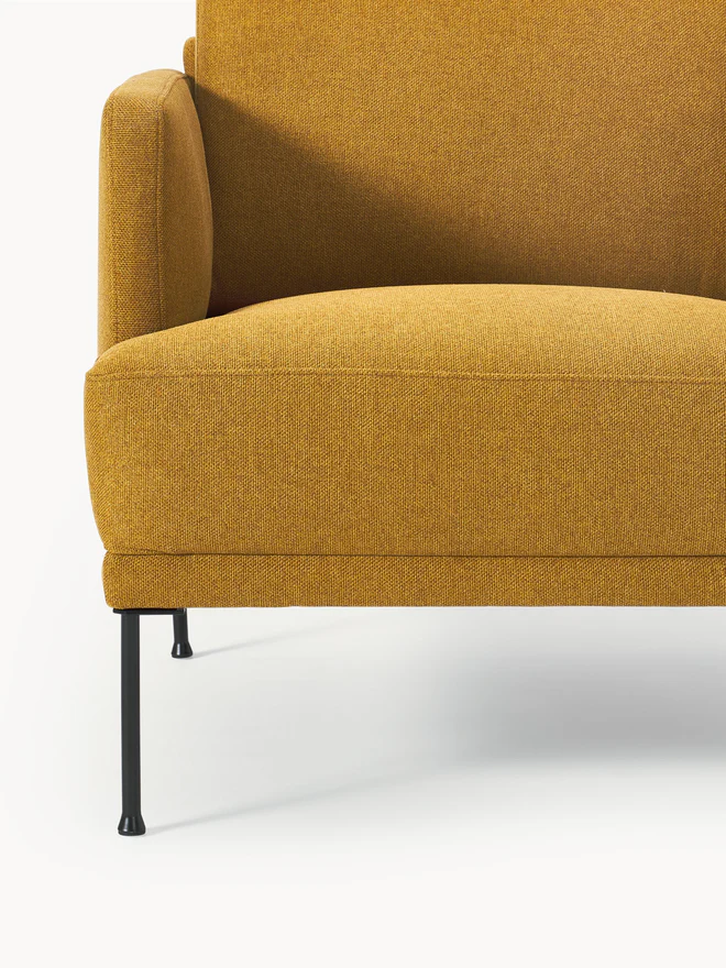 Cover: 100% polyester. The fabric achieves a high value of 115,000 in the Martindale abrasion test, ensuring long-lasting durability, even with intensive use. Due to their high abrasion resistance, fabrics with a Martindale value of 80,000 or higher are particularly durable and also suitable for use in public areas. Padding: Foam padding with Nosag spring suspension. Density: 18-30 kg/m³. Frame: Solid pine wood. Legs: Powder-coated metal. This product is made from sustainably sourced, FSC®-certified wood.