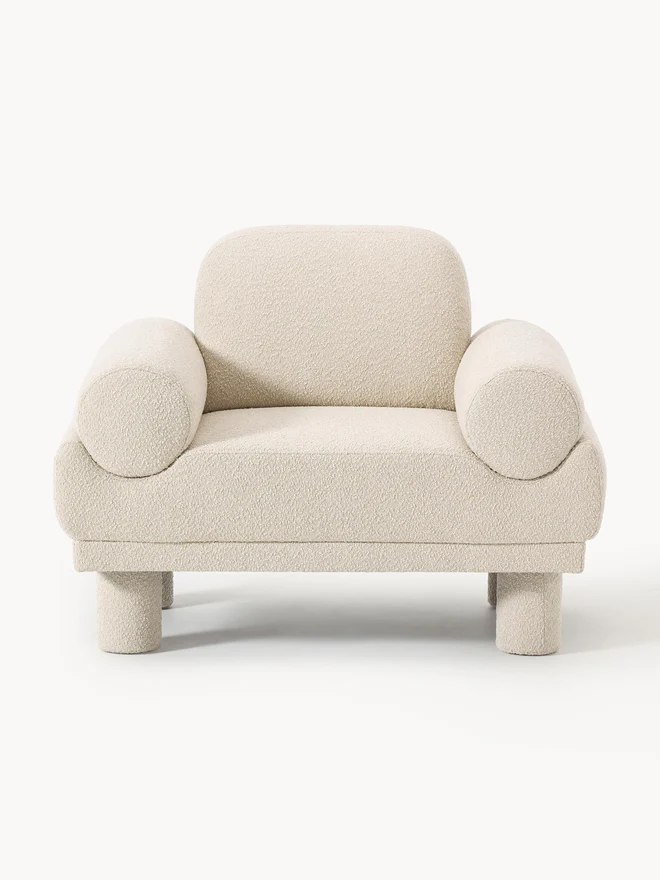 Cover: 93% polyester, 6% acrylic, 1% cotton. Weave: Bouclé. The fabric achieves a high rating of 100,000 in the Martindale abrasion test, ensuring long-lasting durability, even with intensive use. Padding: Polyurethane foam. Density: 37 kg/m³. Base: Fir, spruce, particleboard, fiberboard, medium-density fiberboard (MDF). Feet: Plastic, upholstered. This product is made from sustainably sourced, FSC®-certified wood.
