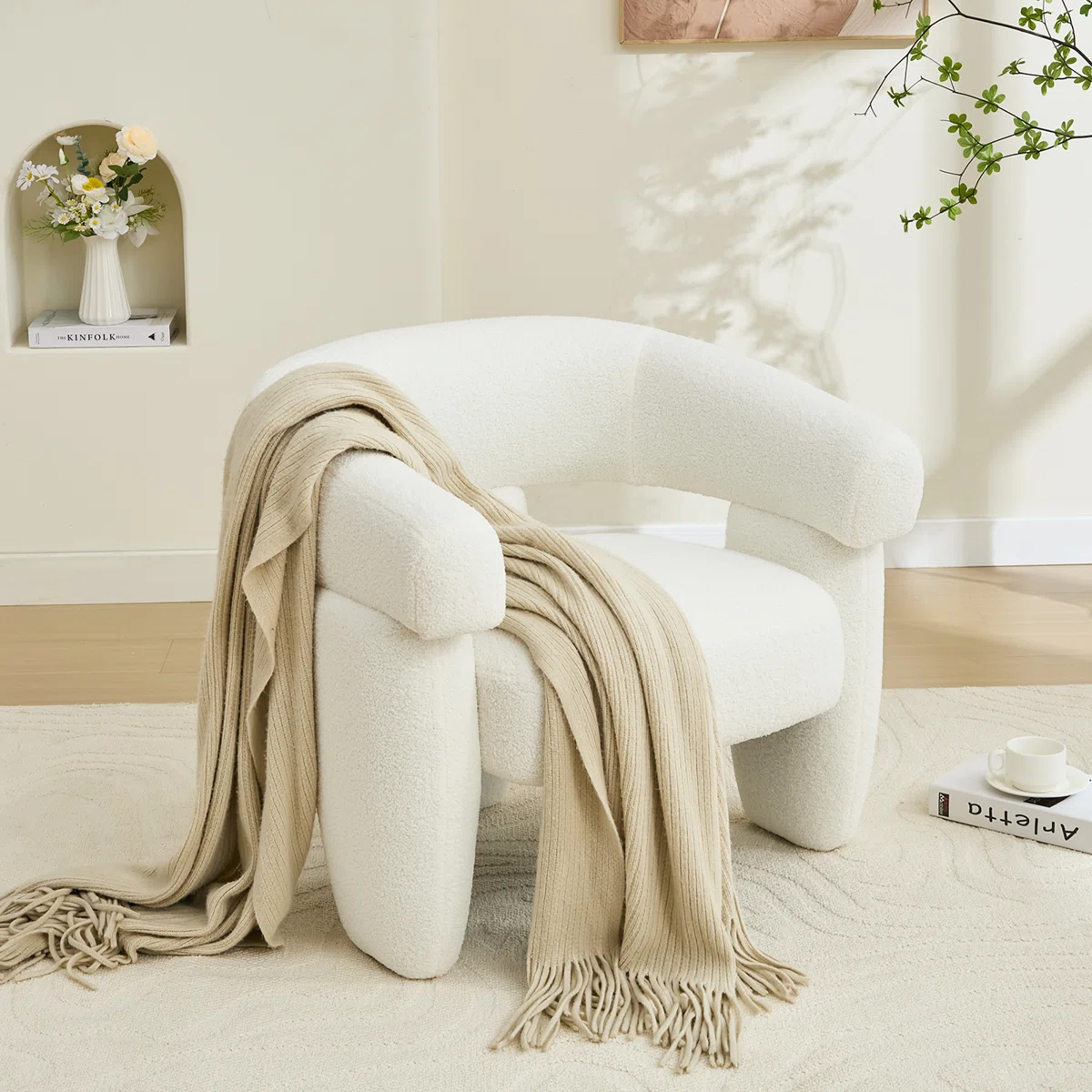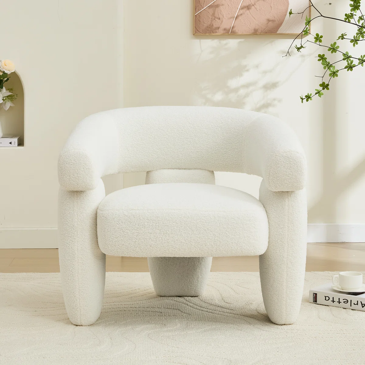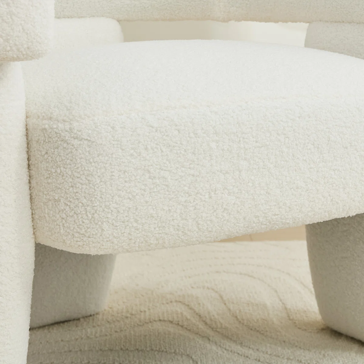 The Liora accent chair blends sleek design with modern functionality. Its distinctive three-legged base adds a contemporary edge while ensuring sturdy support. Upholstered in soft, skin-friendly bouclé fabric, the chair offers a cozy seating experience enhanced by high-resilience foam that resists sagging. Compact yet spacious, it fits effortlessly into living rooms, dining areas, home offices, or dressing rooms, making it a versatile addition to any interior. Easy to assemble in minutes, the Liora chair is the perfect balance of elegance, comfort, and practicality.