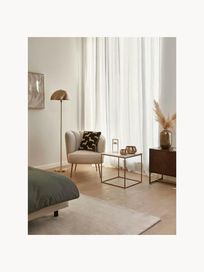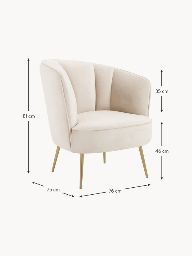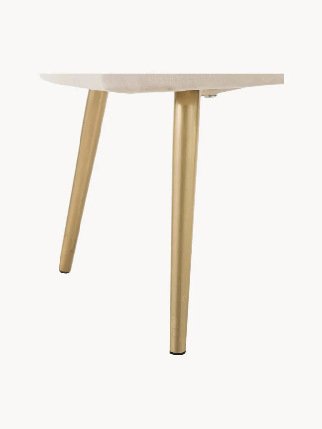 Upholstery: Cream white. Please note that velvet can appear lighter or darker depending on the light and the direction of the nap. Feet: Gold-colored, glossy brushed finish.