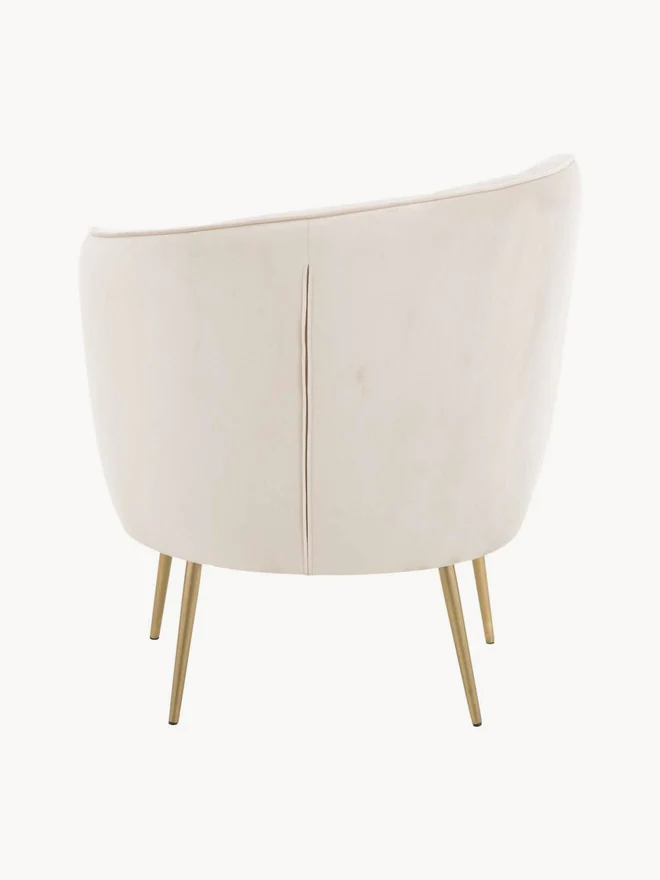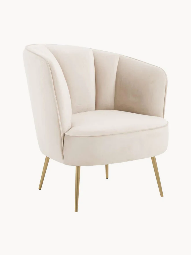 Cream white velvet upholstered furniture with gold brushed metal legs and soft plush finish