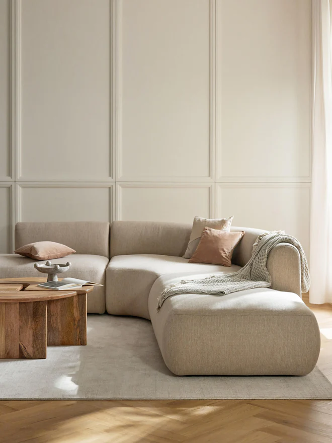 The Sofia modular corner sofa (4-seater) combines contemporary aesthetics with everyday versatilityModular corner sofa Sofia with rounded organic design, 4-seater, eco-friendly upholstery.