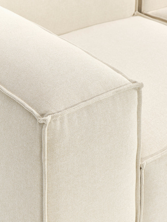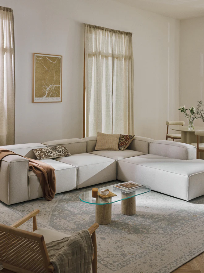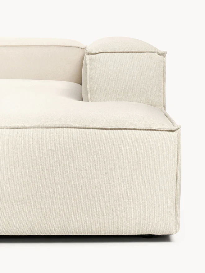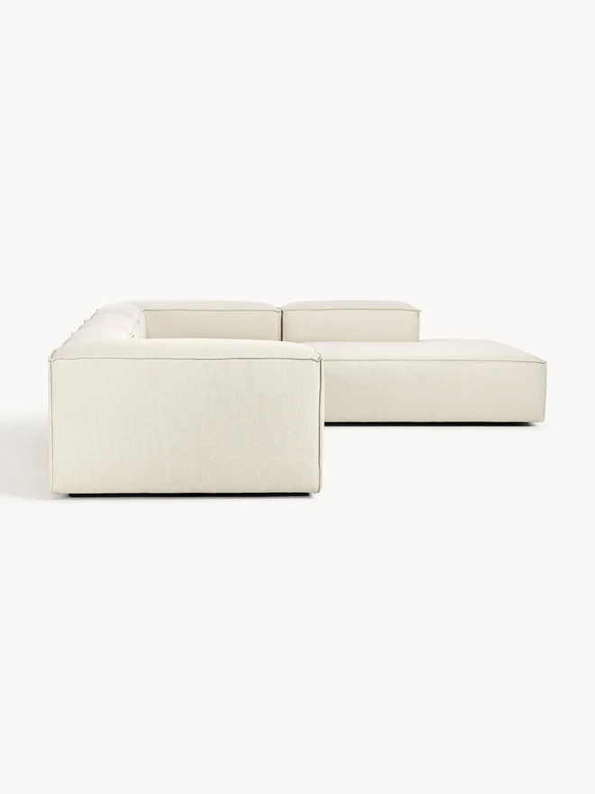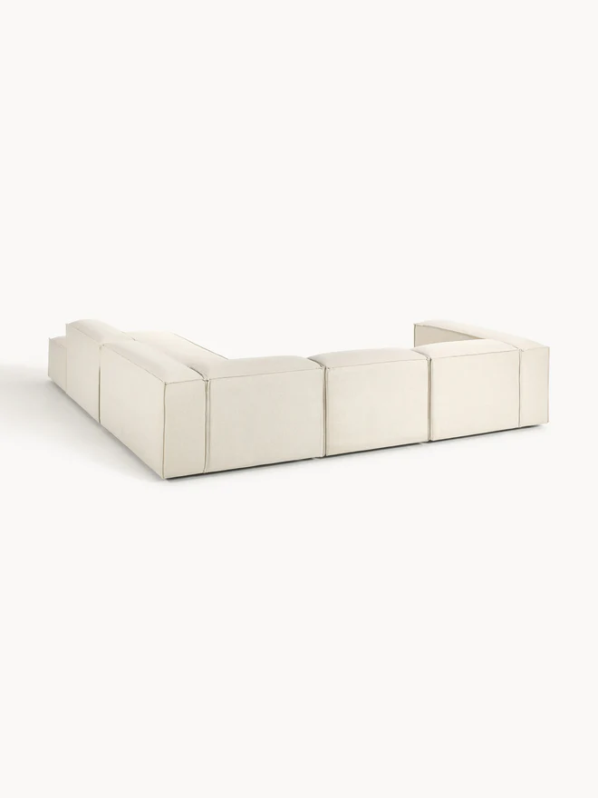 Our modular sofa series LENNON, with its various sizes and elements, is the perfect haven for cozy moments at home. Its signature features—low armrests and backrests, as well as its soft, deep seat—are ideal for lounging and relaxing. The solid pine frame is FSC-certified and built to last, while sewn-in foam cushions with pocket springs guarantee its characteristic shape. Thanks to an easy click system, it can be expanded as desired. Discover other products in our range that perfectly complement LENNON: The LANA console not only offers additional storage space but is also a decorative highlight that fits the LENNON dimensions perfectly. The LENNON ottoman with a wooden top can be used either as a coffee table or as a connecting element for the sofa—for a stylish look, storage, and practical use. And, of course, the perfect finishing touch: sofa cushions in all LENNON fabrics and colors for the perfect look—whether tone-on-tone or patterned and combined. Our modular sofa series LENNON, with its various sizes and elements, is the perfect haven for cozy moments at home. Its signature features—low armrests and backrest, along with its soft, deep seat—make it perfect for lounging and relaxing. The solid pine frame is FSC-certified and built to last, while sewn-in foam cushions with pocket springs guarantee its characteristic shape. Thanks to an easy click system, it can be expanded as desired. Explore our range of perfectly coordinated products that complement LENNON: The LANA console not only offers extra storage space but is also a decorative highlight that fits LENNON’s dimensions perfectly. The LENNON ottoman with a wooden shelf can be used flexibly as a coffee table or as an intermediate element within the sofa—for a stylish look, surface area, and practical storage. And don’t forget the perfect complement: sofa cushions in all LENNON fabrics and colors for the perfect look—either uniformly or in a mix-and-match style. – Lounge sofa with an extra-large seating area – Consisting of four individually combinable modules – Modular: Can be completely combined and expanded as desired with an easy click system – Very durable and easy-care woven fabric, available in many color variations – Made in UAE. When you are standing frontally in front of the sofa, the corner section is on the right side.