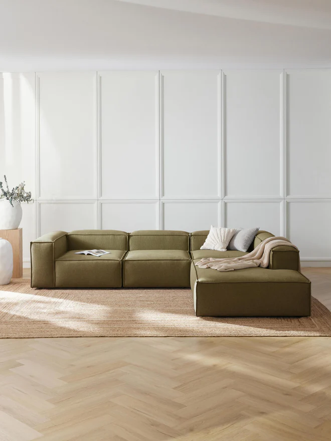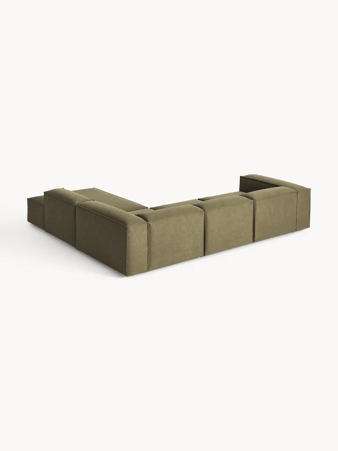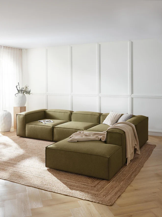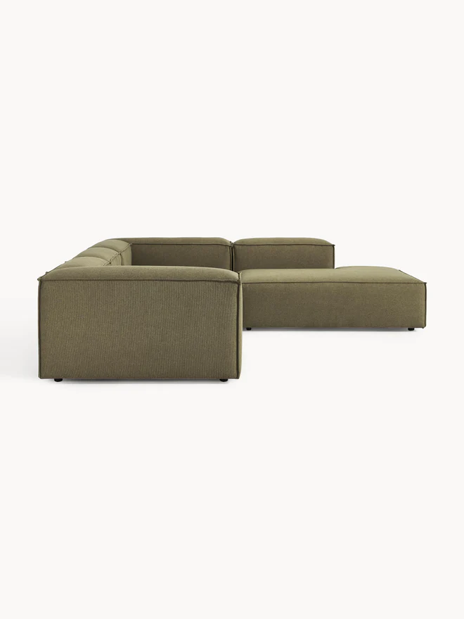 Our modular sofa series LENNON, with its various sizes and elements, is the perfect haven for cozy moments at home. Its signature features—low armrests and backrests, as well as its soft, deep seat—are perfect for lounging and relaxing. The solid pine frame is FSC-certified and built to last, while sewn-in foam cushions with pocket springs guarantee its characteristic shape. Thanks to an easy click system, it can be expanded as desired. Discover other products in our range that perfectly complement LENNON: The LANA console not only offers additional storage space but is also a decorative highlight that fits the LENNON dimensions perfectly. The LENNON ottoman with a wooden top can be used either as a coffee table or as a connecting element for the sofa—for a stylish look, storage, and practical use. And, of course, the perfect finishing touch: sofa cushions in all LENNON fabrics and colors for the perfect look—whether tone-on-tone or patterned and combined. Our modular sofa series LENNON, with its various sizes and elements, is the perfect haven for cozy moments at home. Its signature features—low armrests and backrest, along with its soft, deep seat—make it perfect for lounging and relaxing. The solid pine frame is FSC-certified and built to last, while sewn-in foam cushions with pocket springs guarantee its characteristic shape. Thanks to an easy click system, it can be expanded as desired. Discover other matching products in our range that are perfectly coordinated with LENNON: The LANA console not only offers extra storage space but is also a decorative highlight that fits LENNON’s dimensions perfectly. The LENNON ottoman with a wooden shelf can be used flexibly as a coffee table or as an intermediate element within the sofa—for a stylish look, surface area, and practical storage. And don’t forget the perfect complement: sofa cushions in all LENNON fabrics and colors for the perfect look—either uniformly or in a mix-and-match style. – Lounge sofa with an extra-large seating area – Consisting of four individually combinable modules – Modular: Can be completely combined and expanded as desired with an easy click system – Very durable and easy-care woven fabric, available in many color variations – Made in Europe. When you are standing frontally in front of the sofa, the corner section is on the right side.