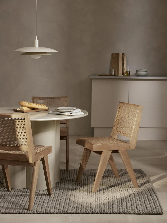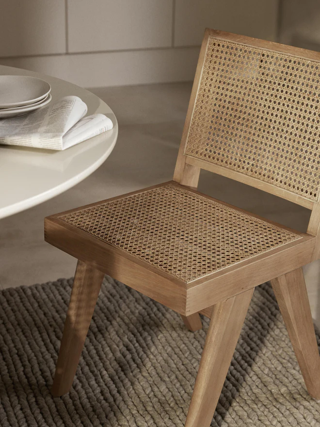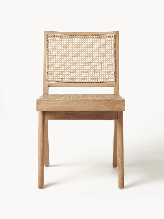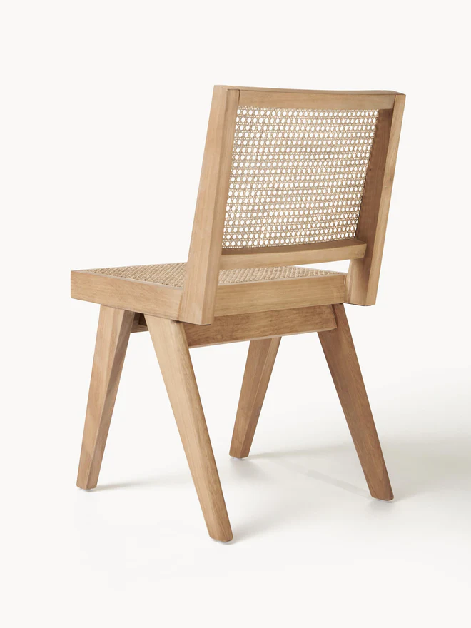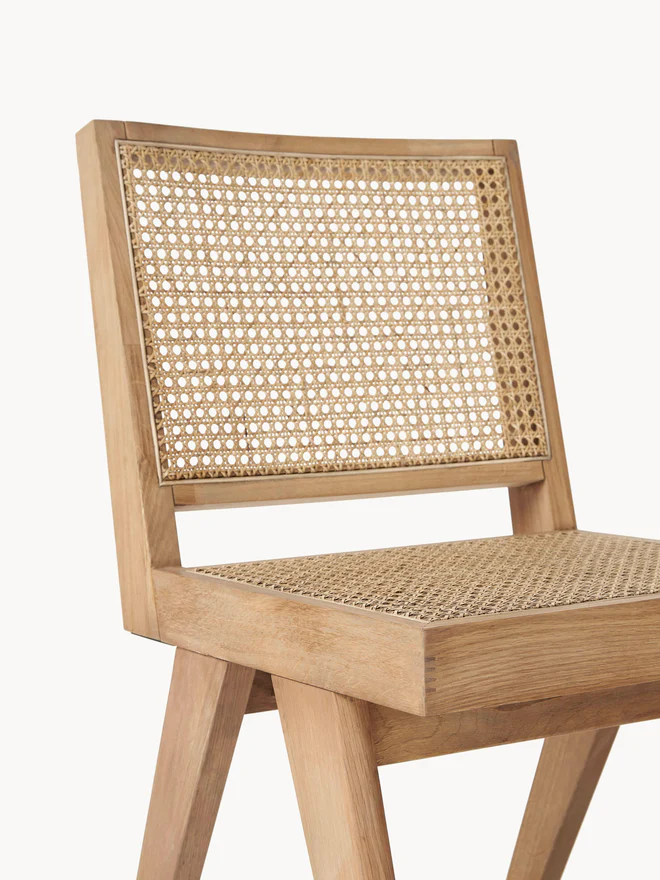 SISSI wooden chair with Viennese caning, inspired by Pierre Jeanneret’s 1950s design, blending modern aesthetics with traditional craftsmanship