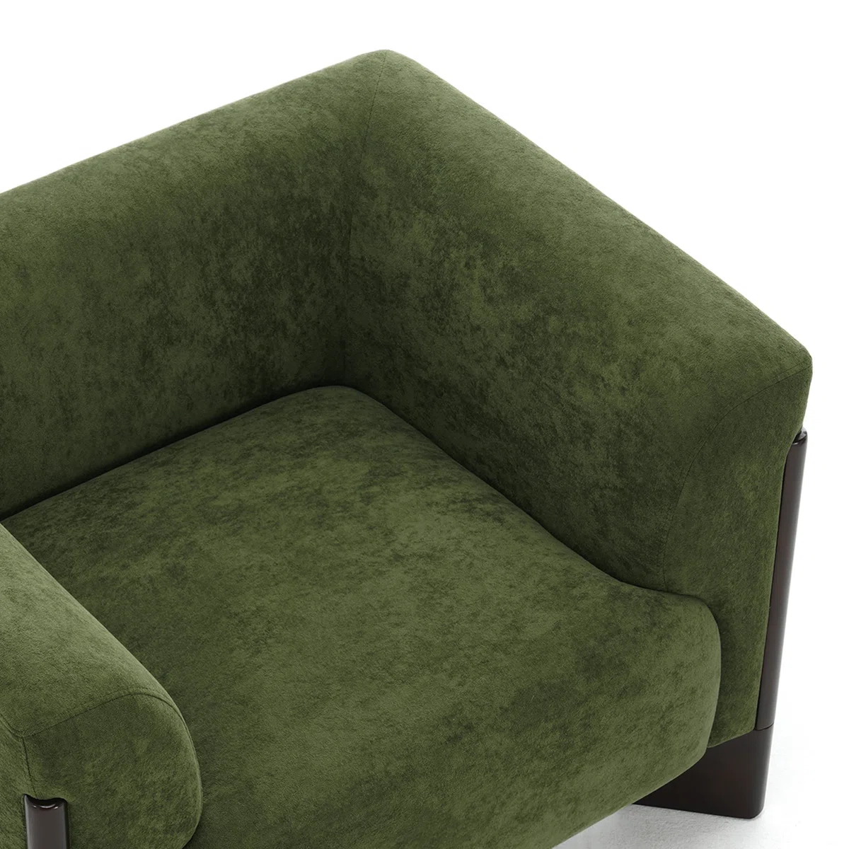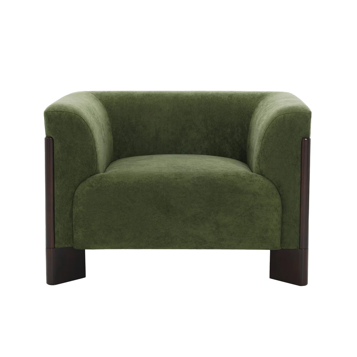 Its structured silhouette, defined by clean lines and wide tuxedo-style armrests, creates a bold yet calming presence in any room. The curved arm design softens the overall look, making it a perfect balance of modern sophistication and inviting comfort. Supported by dark solid wood legs and a robust internal wooden frame, this chair ensures long-lasting stability and strength.