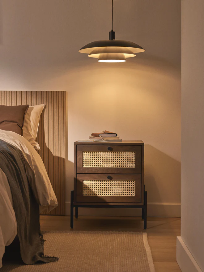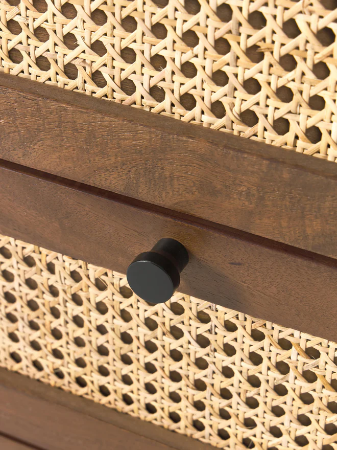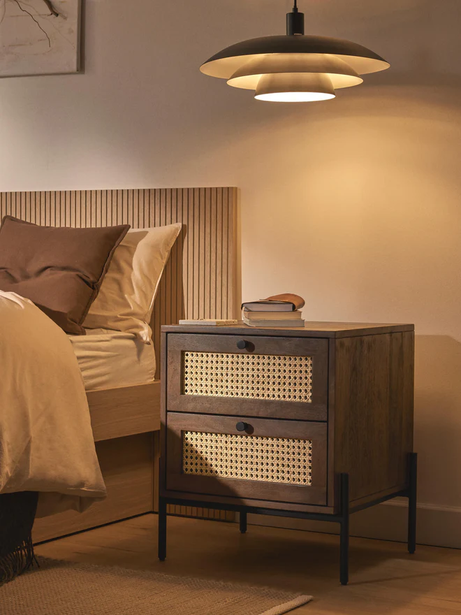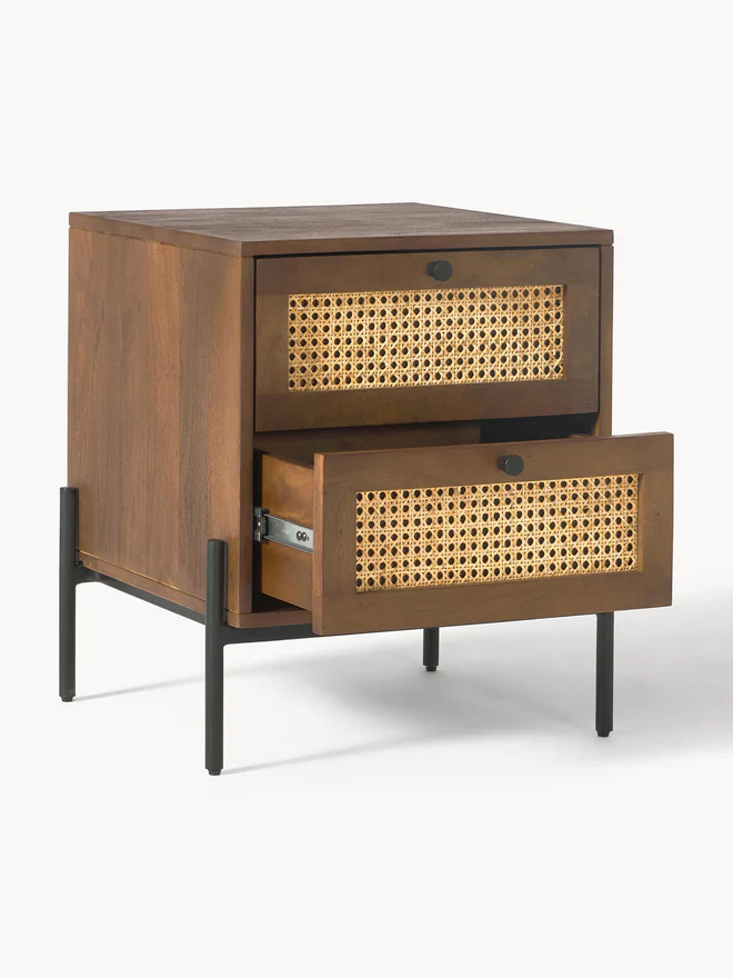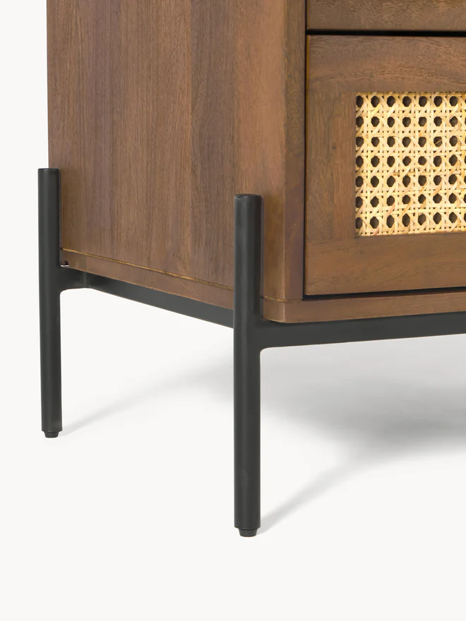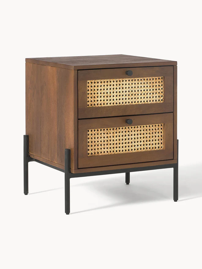 From Viennese coffee houses to the wishlist of every trendsetter: Viennese wickerwork is the must-have material of the moment. The typical woven pattern impresses with a unique design that perfectly complements Scandinavian, boho, and retro styles. Our Vienna series embraces this trend and translates it into a cool collection of unique furniture pieces and statement lamps! The bedside table features two drawers.